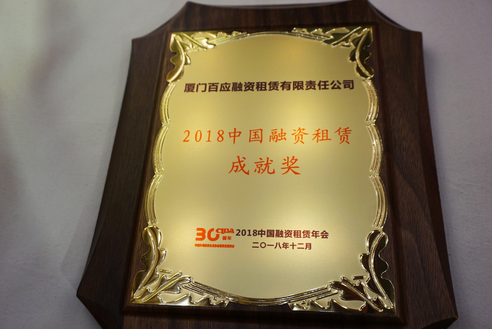 由中国外商投资企业协会主办、中国外商投资企业协会租赁业工作委员会承办的“2018中国融资租赁年会”于12月5日、6日在北京举办。厦门百应融资租赁有限责任公司荣膺中国融资租赁榜“成就奖”。该奖项主要鼓励本年度在不同方面具有明显优势,具有较强的示范性,做出突出业绩的融资租赁公司,以引导行业更好地贯彻国家产业政策、提高服务质量、加强行业自律,推动优势互补、业务创新,促进行业健康发展。